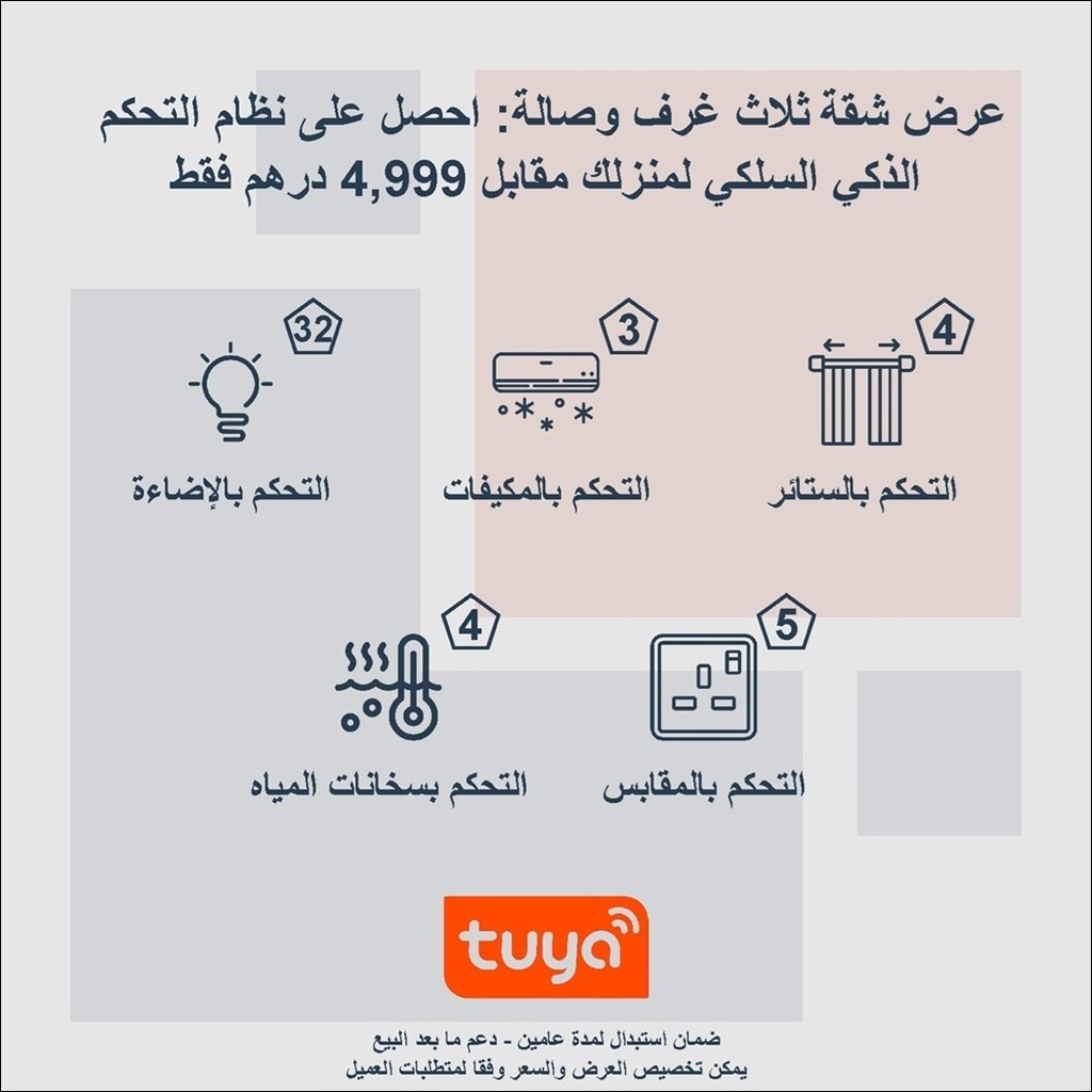This exclusive offer presents a comprehensive smart home automation package for just 4,999 AED. It’s designed to transform your living space into a modern, connected environment. The package includes a wide array of devices to control lighting, climate, ac, and curtains for ultimate convenience.