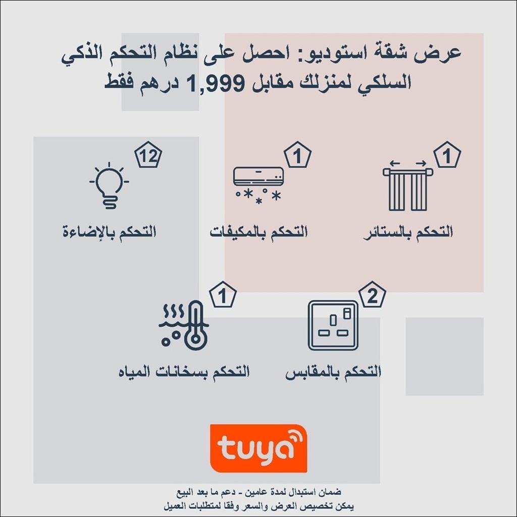 This exclusive offer presents a comprehensive smart home automation package for just 1,999 AED. It’s designed to transform your living space into a modern, connected environment. The package includes a wide array of devices to control lighting, climate, ac, and curtains for ultimate convenience.